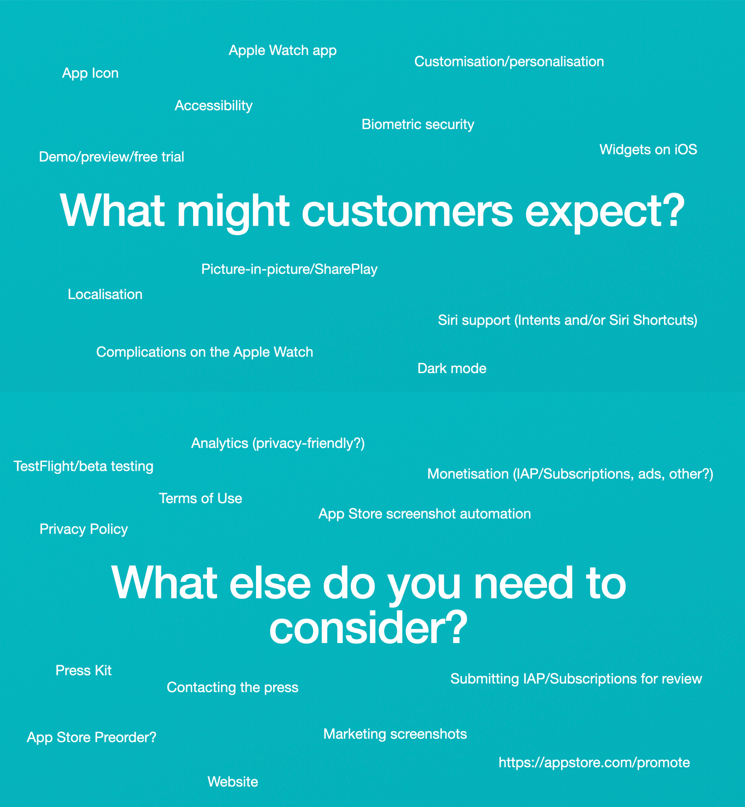 Delivered in April 2023 at the Sydney CocoaHeads Meetup, this is a talk in two parts about launching an app. The first part discusses all the things you might want to consider before considering an iOS app "complete" in 2023, followed by the second part which is all about what to consider between finishing the code for your app and actually launching it – things like a website, marketing pages, App Store metadata, contacting the press, etc.